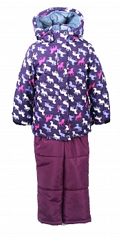 Костюм- куртка и полукомбинезон.Куртка удлиненная, с внутренней кулиской, воротник стойка и сьемный капюшон с отстегивающейся меховой опушкой. 2 нижних прорезных кармана на замке. Центральный замок закрыт ветрозащитной планкой.Куртка простегана резинкой.По рукаву 2 строчки резинкой.Вышивка цветочки.
